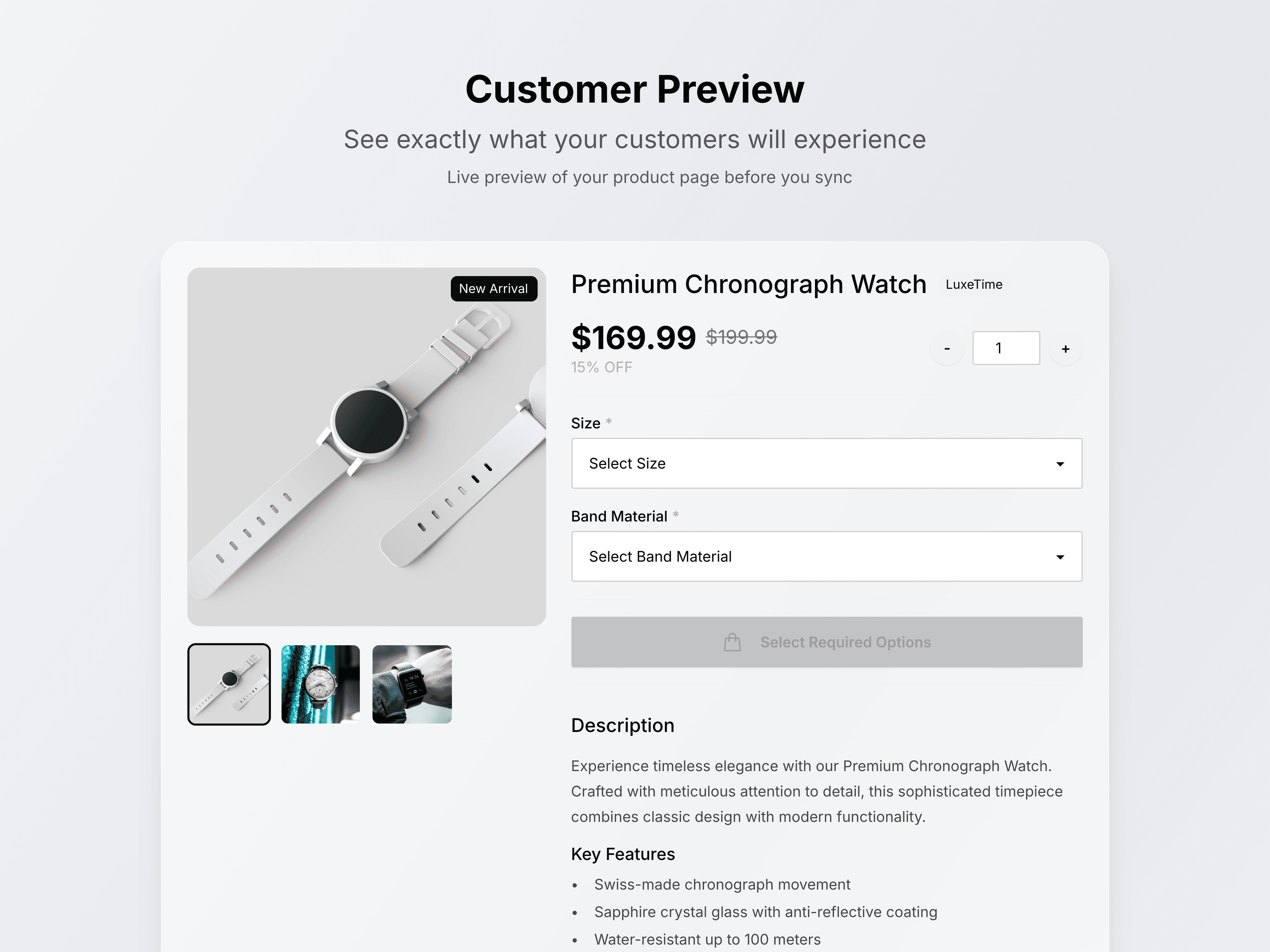 Manage complex pricing rules with an intuitive visual interface. Perfect for products with multiple options like size, material, and color.