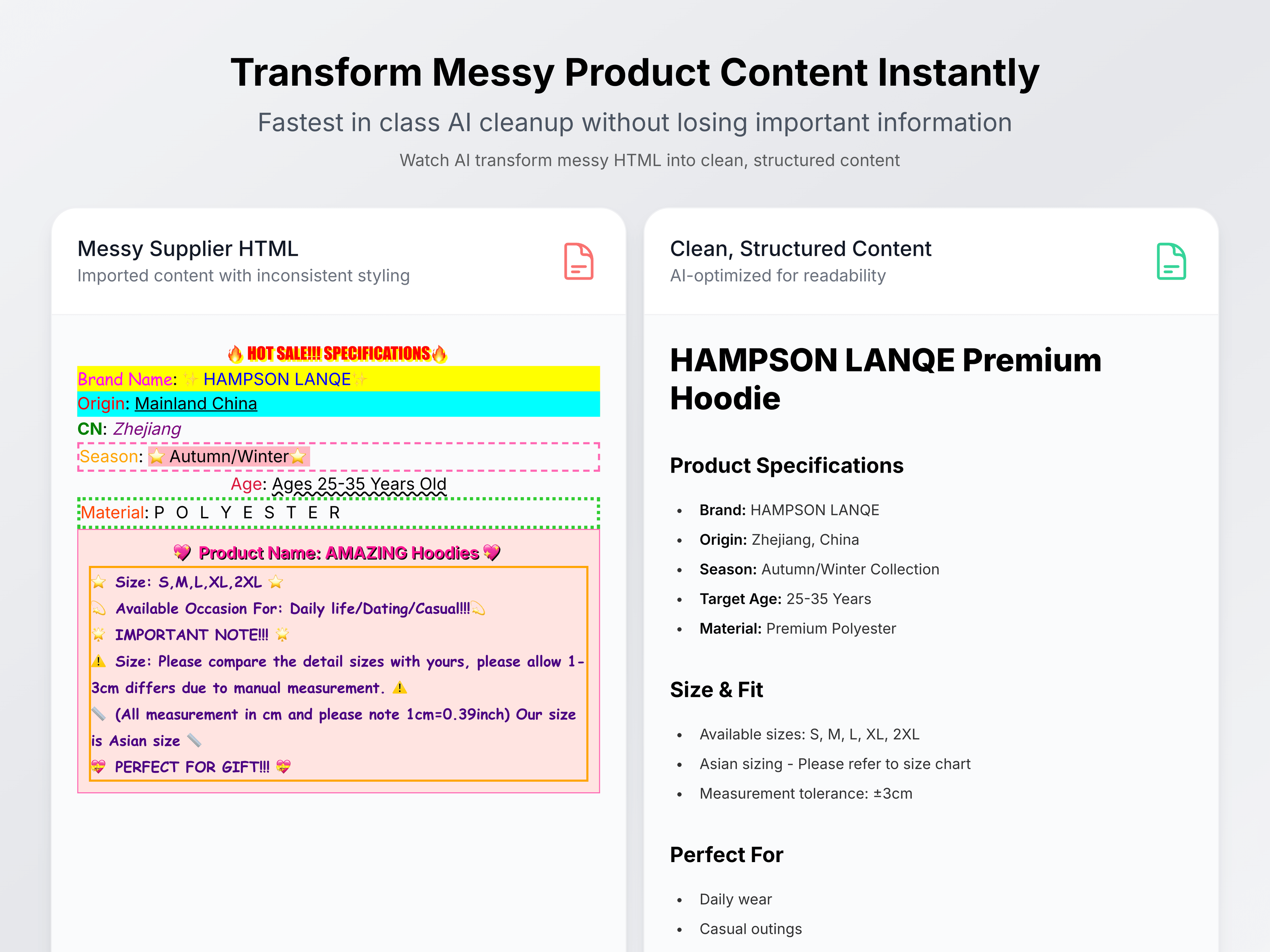 Transform messy supplier content into clean, professional product information. Maintain consistent branding across your catalog.